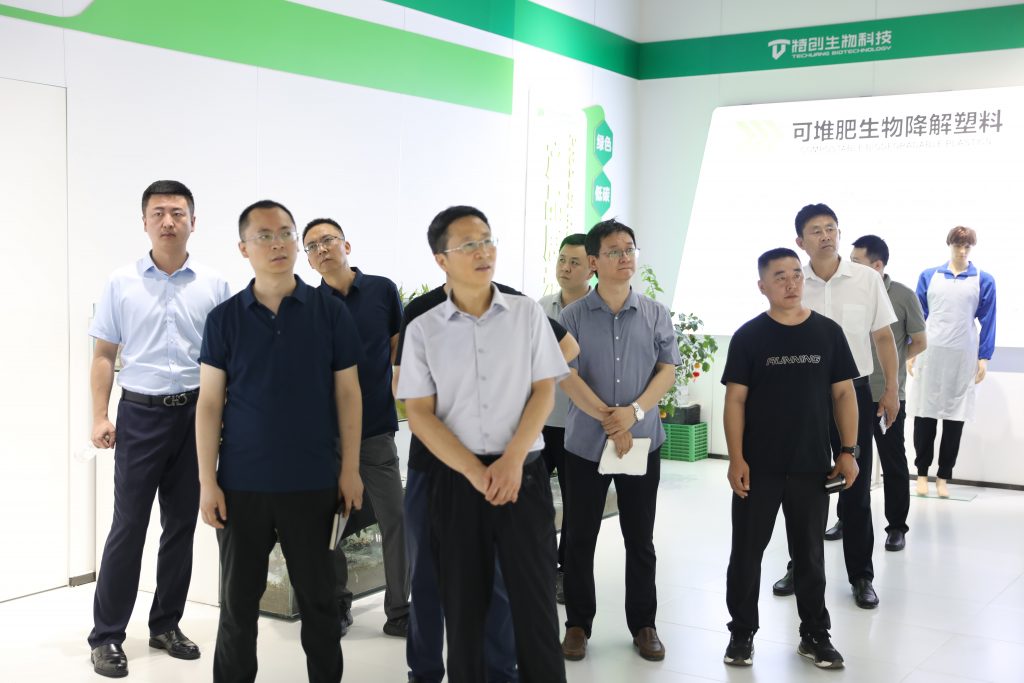郜善軍一行首先來(lái)到公司產(chǎn)品展廳,詳細(xì)了解了河南特創(chuàng)豐富的可降解產(chǎn)品系列,對(duì)公司產(chǎn)品的技術(shù)領(lǐng)先性、環(huán)保效益及市場(chǎng)前景給予高度評(píng)價(jià)。他指出,河南特創(chuàng)在可降解材料領(lǐng)域的深耕,契合全球環(huán)保潮流與國(guó)家綠色發(fā)展戰(zhàn)略,前景廣闊。隨著環(huán)保意識(shí)的提升與政策扶持,可降解材料市場(chǎng)將迎來(lái)爆發(fā)式增長(zhǎng),河南特創(chuàng)的技術(shù)實(shí)力與市場(chǎng)拓展能力將成為行業(yè)發(fā)展的重要驅(qū)動(dòng)力。